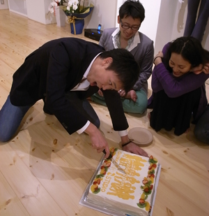 このケーキ、僕や建築家の高山さんのプライベートの知人で、いつも僕たちの事を応援してくれている方が、