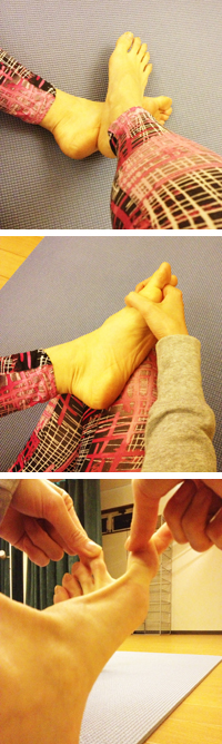 2:片方の足に反対側の手の指を5本全部挟みギュッと握ったり、ぐるぐる回して足首をマッサージしたりします。
